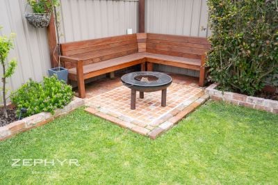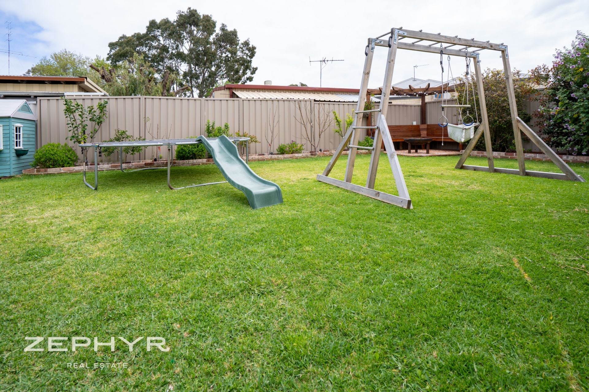 Outdoors, the backyard invites relaxation with a fire pit and sitting area nestled in the rear corner, making it perfect for entertaining or enjoying peaceful evenings under the stars.