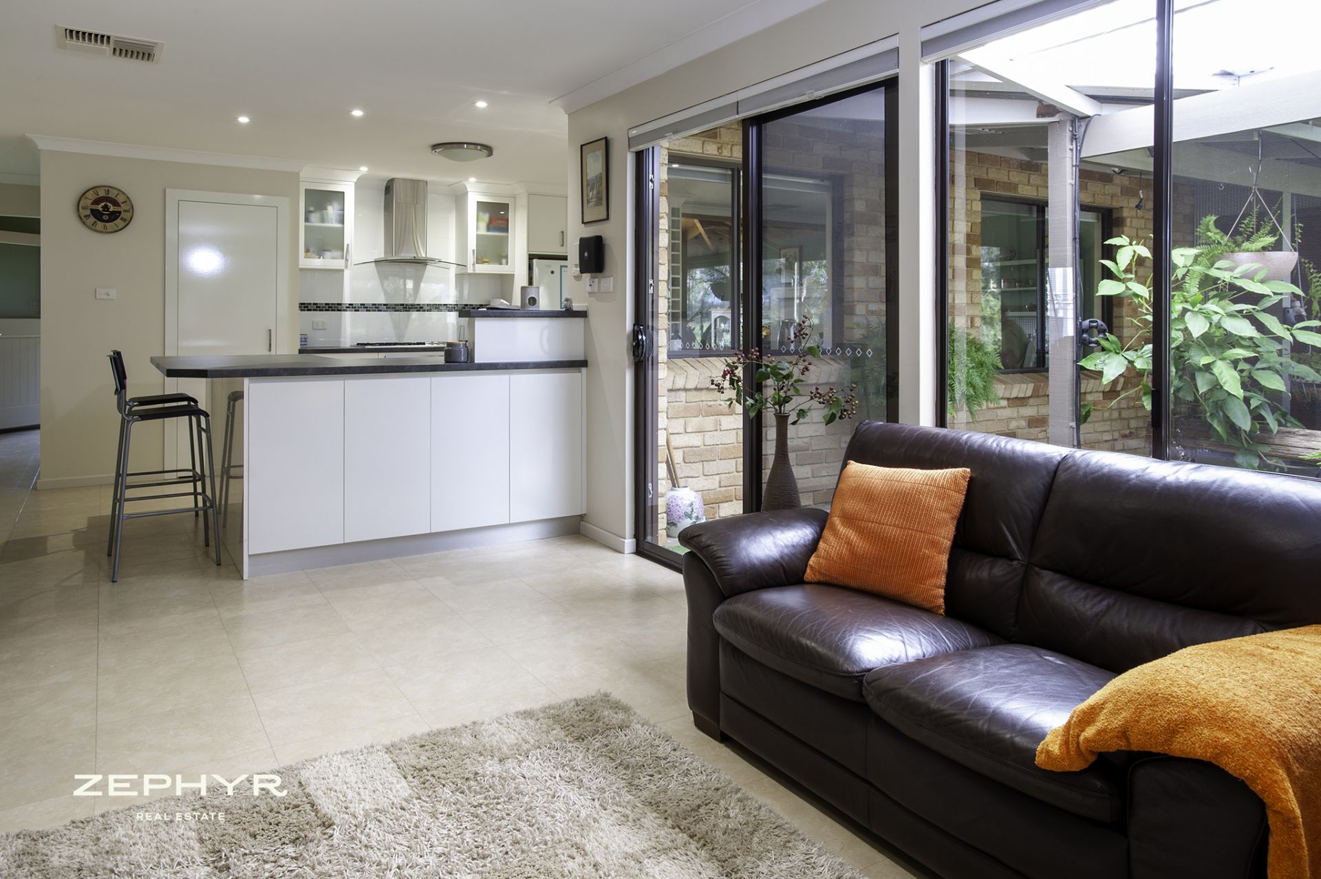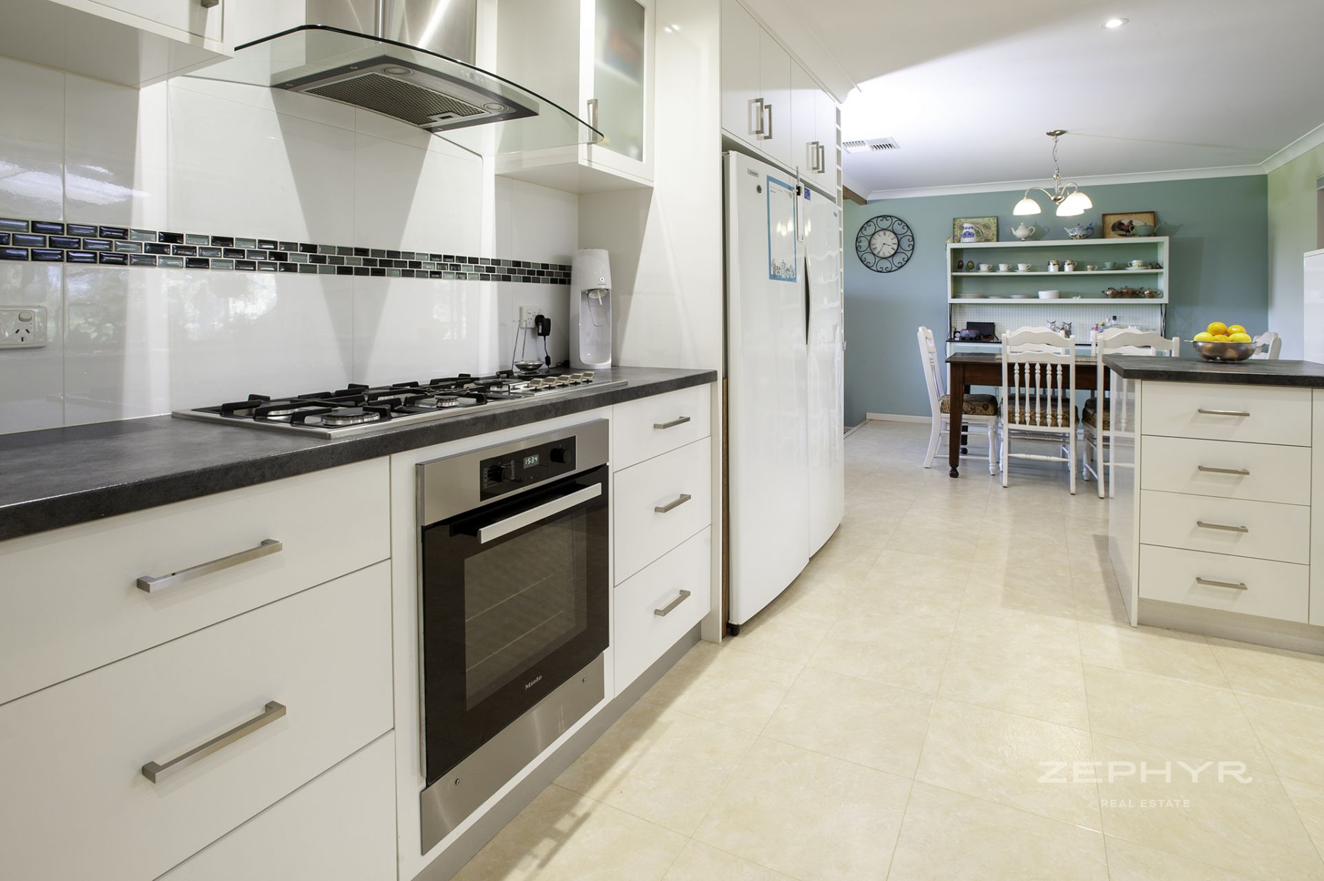 Modern kitchen, open plan living, gas cooktop, electric oven.