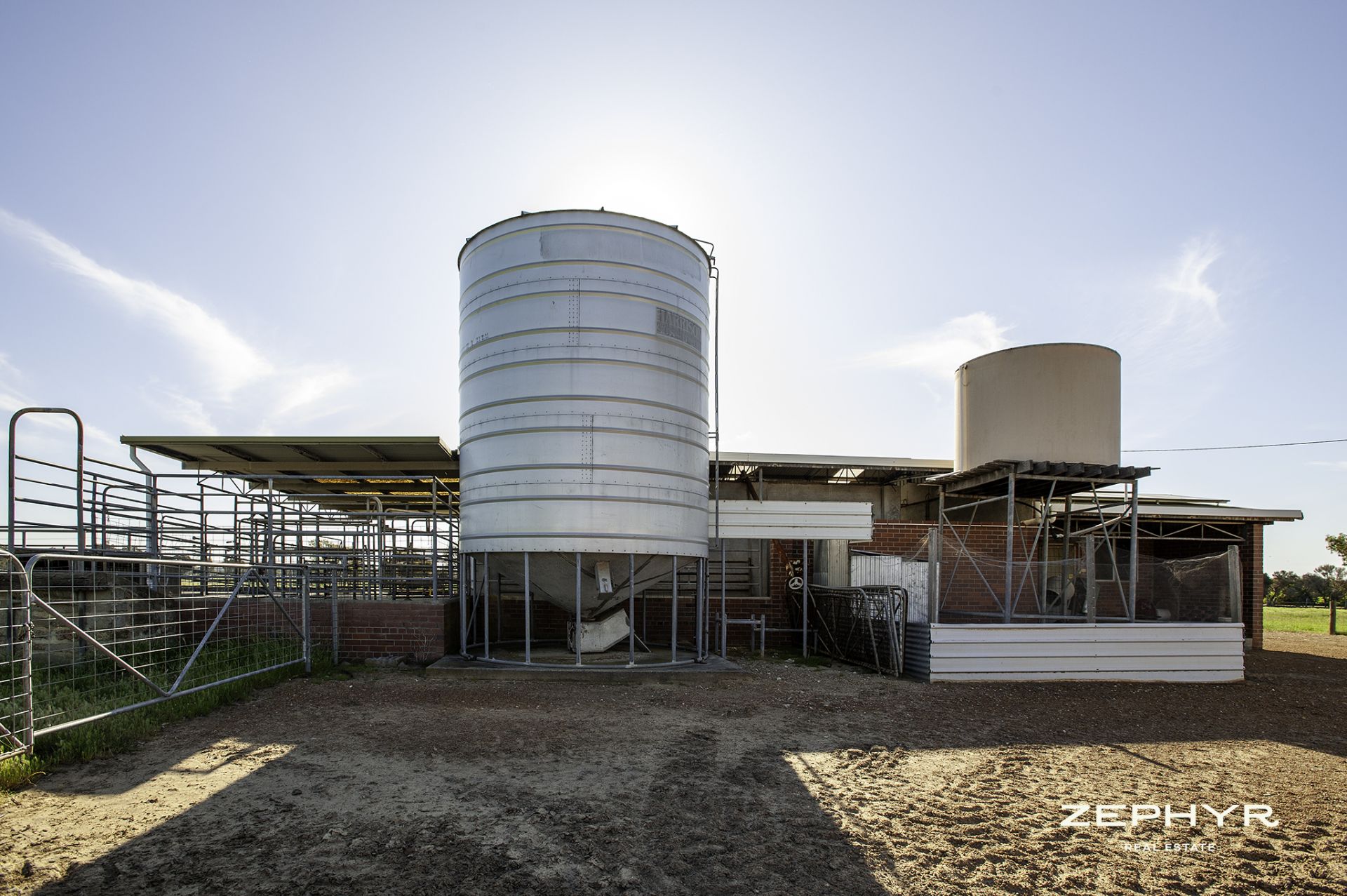 Rain water tanks 54kl (12 000gal) and 90kl (20 000gal) supply house. The larger tank collects water from the hay shed.
