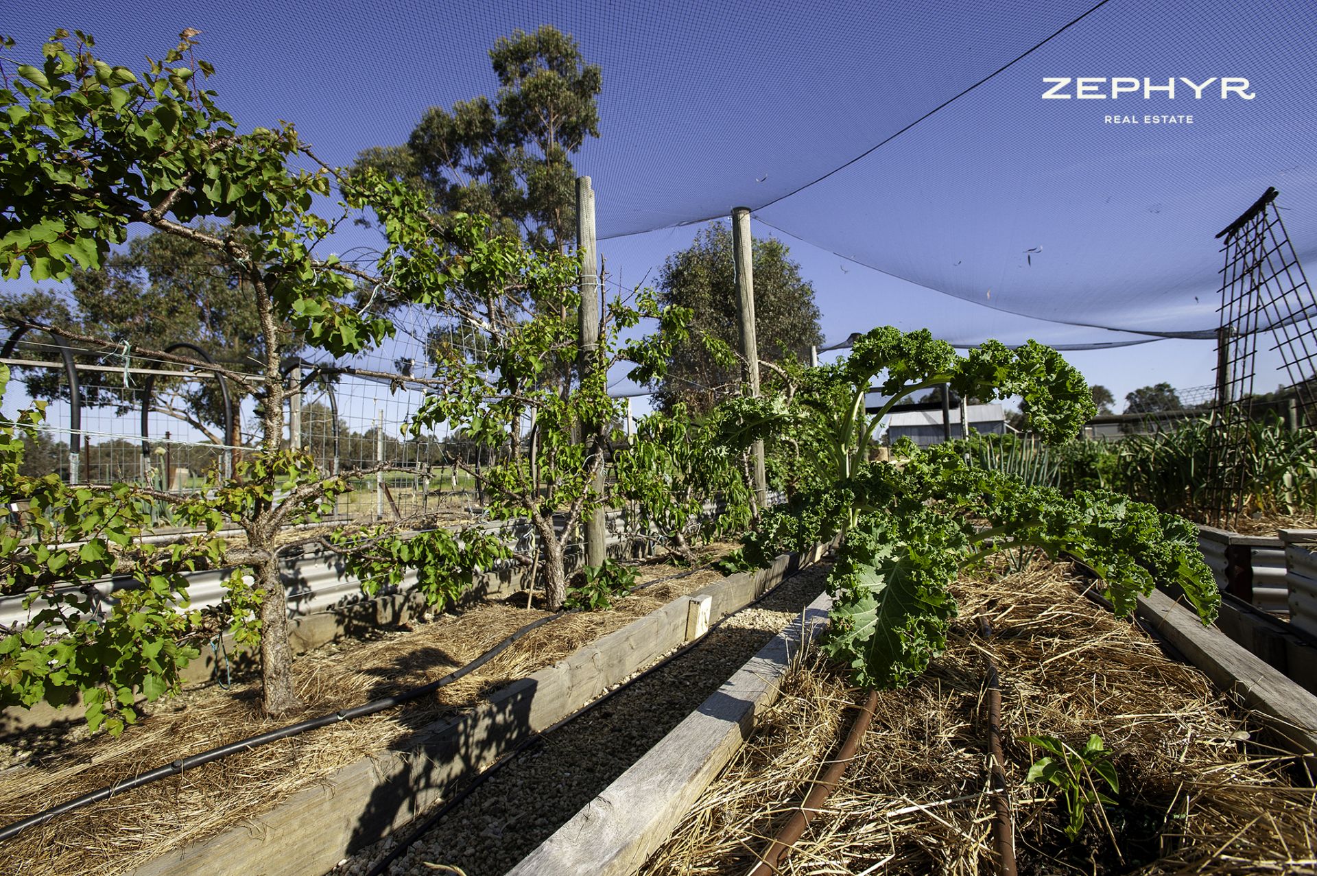 Netted vegetable garden with espaliered fruit trees