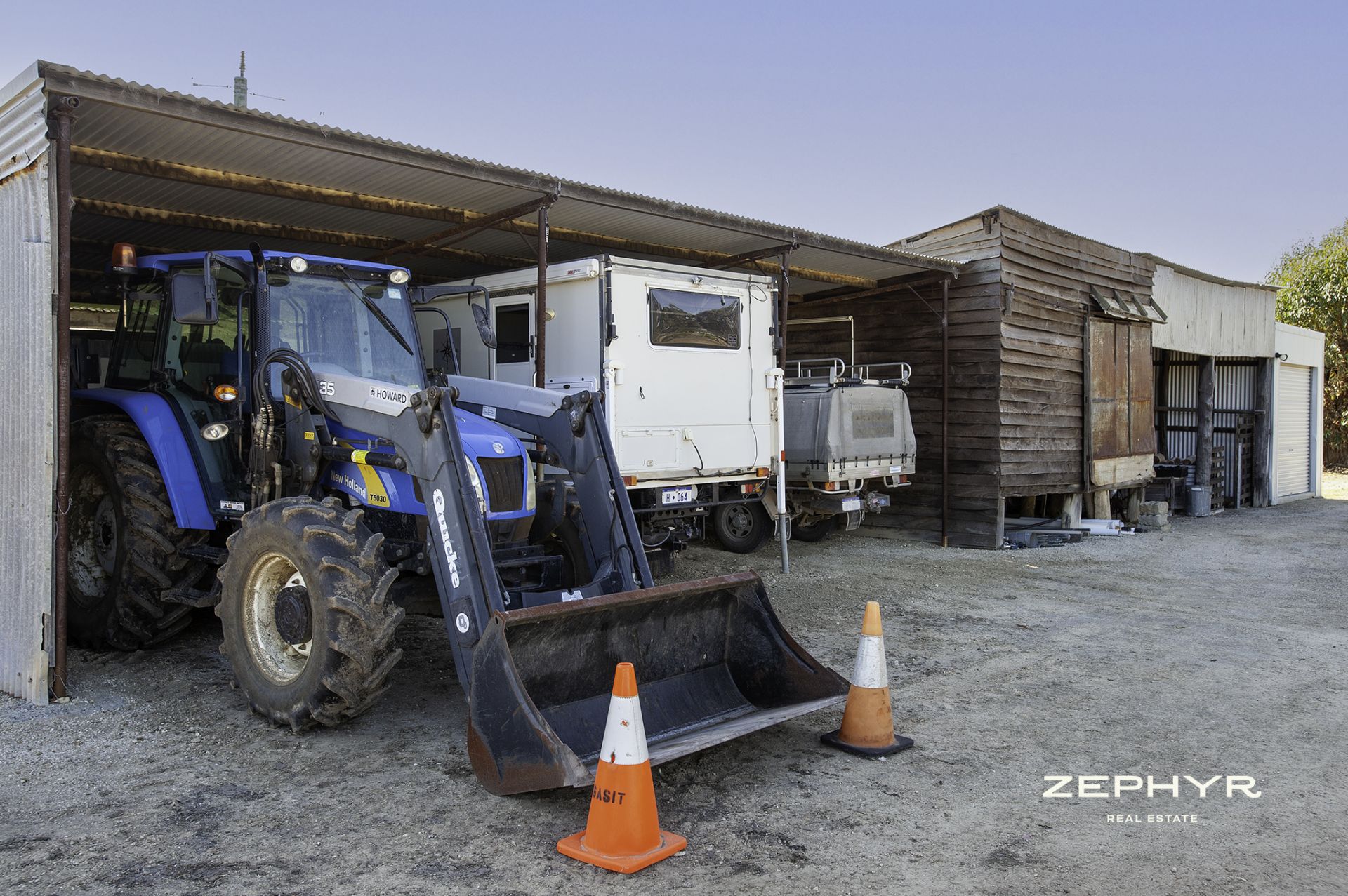 3 bay machinery shed 9.9m x 6.2m of steel poles and iron. Electricity connected.