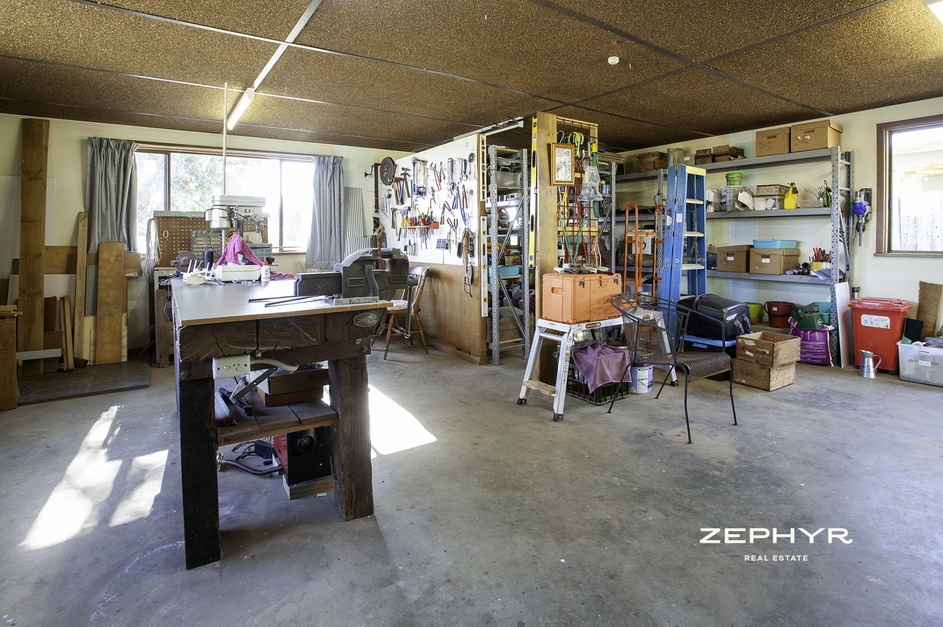 2 bay shed with another bay with sliding door with a raised floor to match height of a tray back vehicle, making it ideal for transferring heavy gear e.g. rolls of fencing wire. This is a historic original shed made from split bush timber and wooden stumps with a recent iron roof and on the end is a 1 bay shed 3.7m x 6.2m lockable, concrete floor currently used as another vehicle garage. Electricity connected.